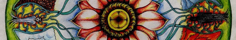 Toobs, toobies! Loopy, thinny all twisty, slippery, pink and red and green and flower, honey-bee tasty! Sound, music! There’s the hippy squeaker, hippy hippo, then a howler, listen to shouty; not nice, not nice. All grey and moany. Gets scary, careful, careful, not too close. Pull in, suck in, watch it now, well I’ll be.... Not too close. It’s said, he says, he says not too close! Oh no! Too close! Pull him in, then he’s stuck, can’t get out, poor indie, poor, poor little indie. Now he’s fucked. Oh well, can’t be helped, no help for it, nothing to help for it. Coil about and all shapey with the given form, slow turn, nowt to do but wait, forever wait. Fucked now, eh? Not kidding matey! No matter, wait, wait, wait. Be a long soon, we’ll see, we’ll be seen, he’ll be seeing, then we’ll see. Help’ll come. Along’ll be help, hooray!